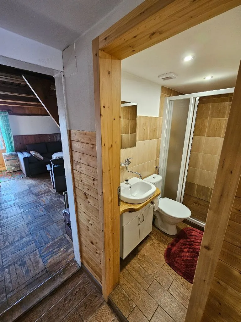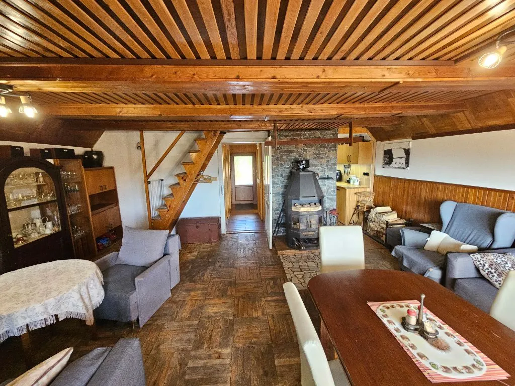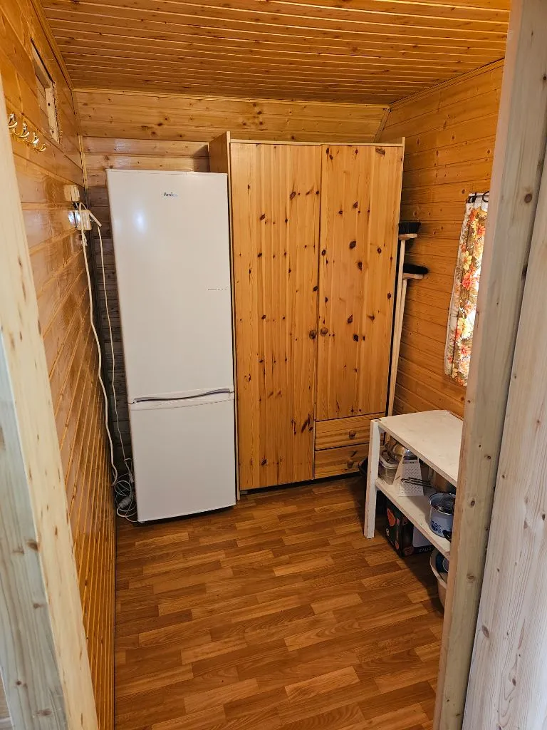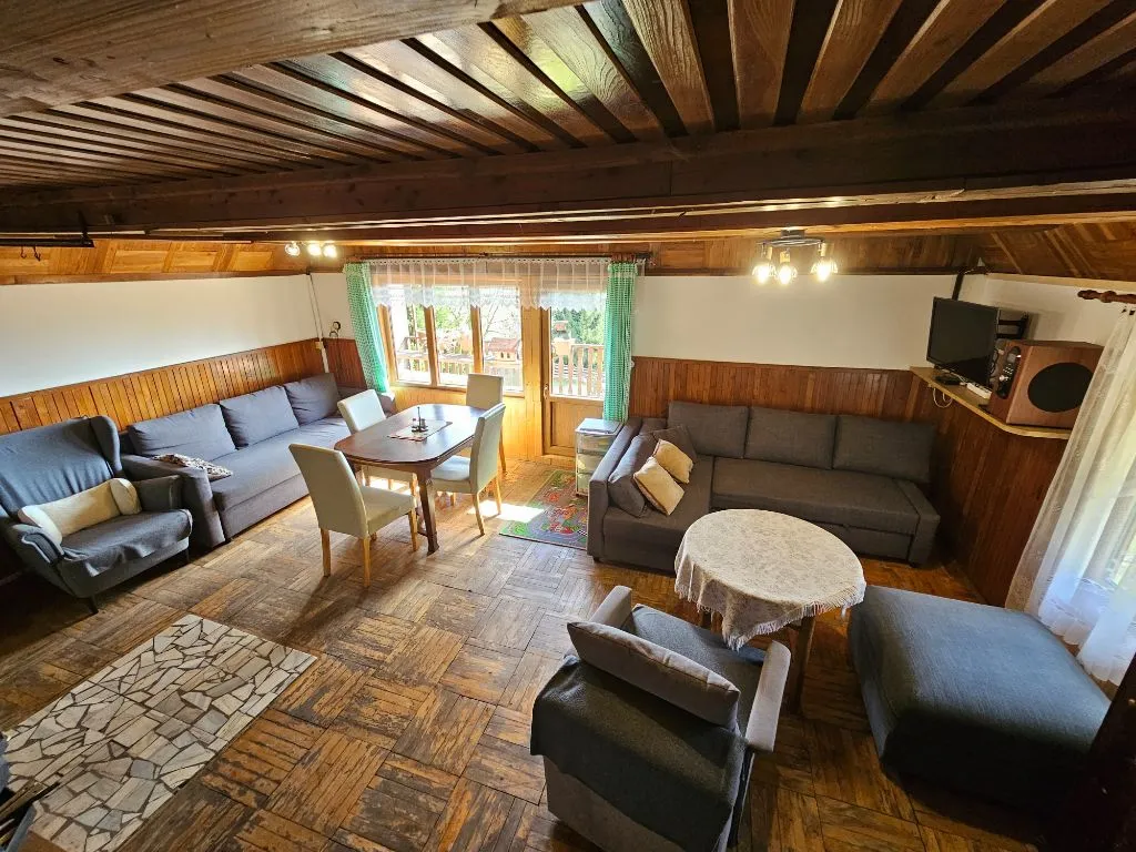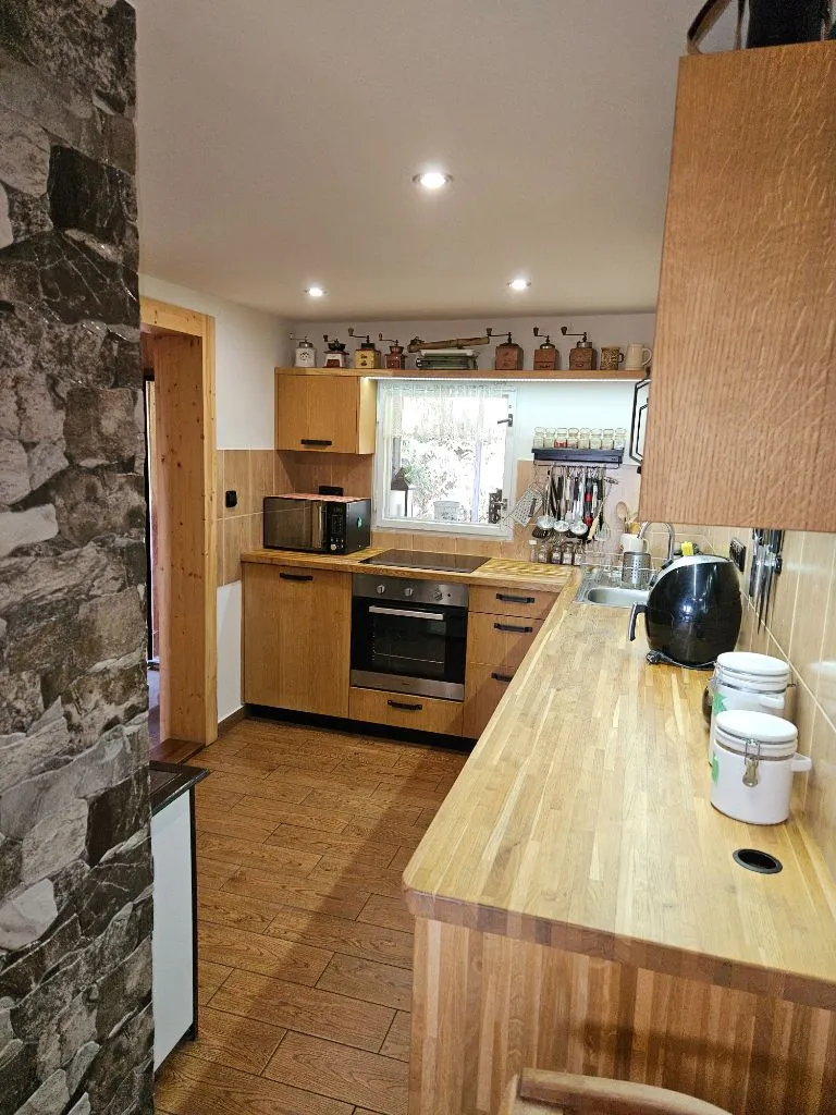 V přízemí společenská místnost s rozkládacím gaučem (možnost dvou přistýlek), krbovými kamny a BTV, samostatná kuchyně vybavena el. chladničkou, mikrovlnnou troubou, el. vařičem, sporákem na pevná paliva, rychlovarnou konvicí, nádobím aj., sprchový kout a WC.