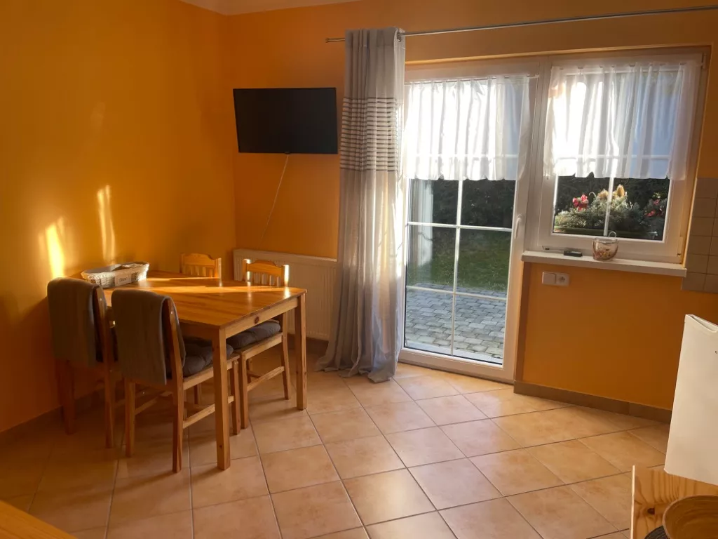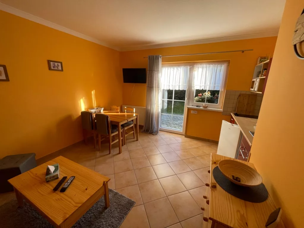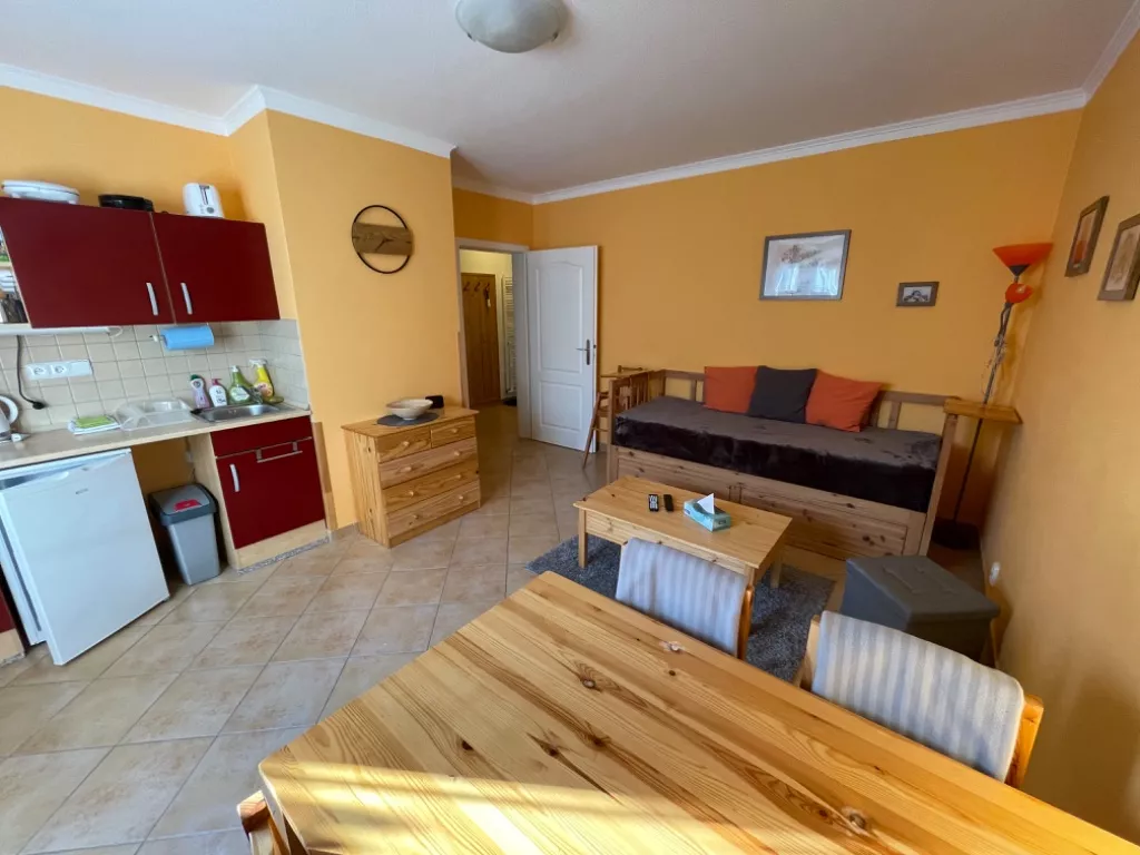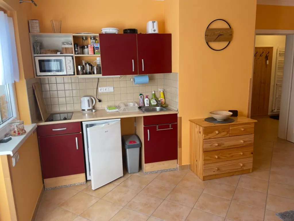 Kuchyň je vybavena jídelním stolem, mikrovlnou troubou, dvouplotýnkovým vařičem, lednicí s mrazáčkem, varnou konvicí a ostatním kuchyňským vybavením