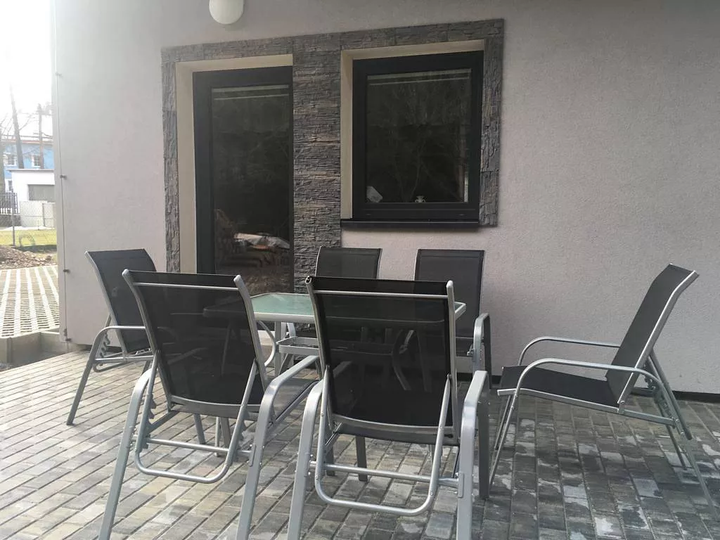 Přízemí: obývací pokoj s možností přespání na rozkládací sedací soupravě, vybavená kuchyň s jídelnou, koupelna se sprchovým koutem, WC, terasa se zahradním nábytkem u každého apartmánu, ohniště, gril, parkoviště, Wi - Fi).
