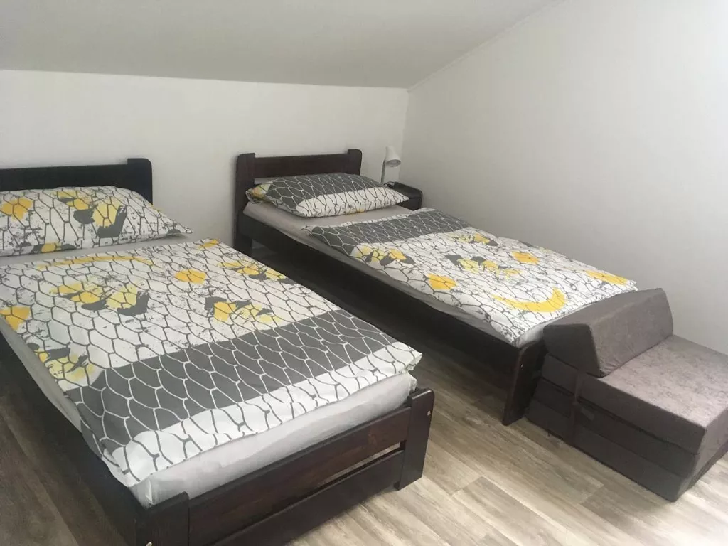 Jedná se o 2 apartmány o velikosti 1+3 (I. patro: ložnice s manželkou postelí, dětský pokoj s 2 postelemi s možností přistýlky a WC s umyvadlem.