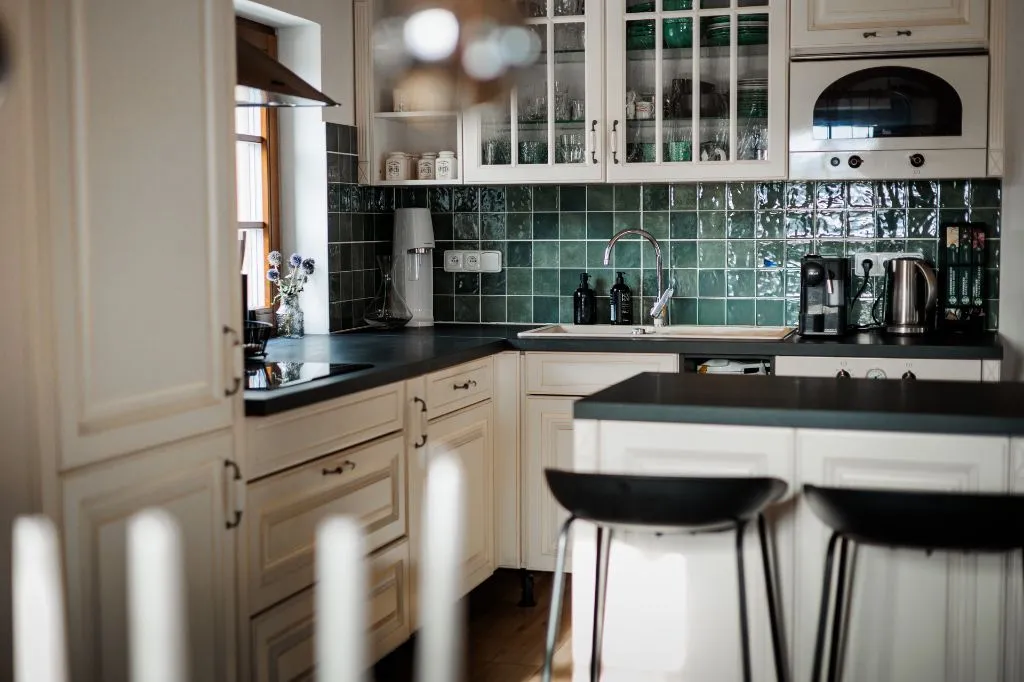 Vybavená kuchyň a jídelna (myčka, indukční deska, el. trouba, lednice, mikrovlnka, rychlovarná konvice, kávovar, toustovač, nádobí pro 10 osob, jídelní stůl, židle, lavice, dětská židlička).