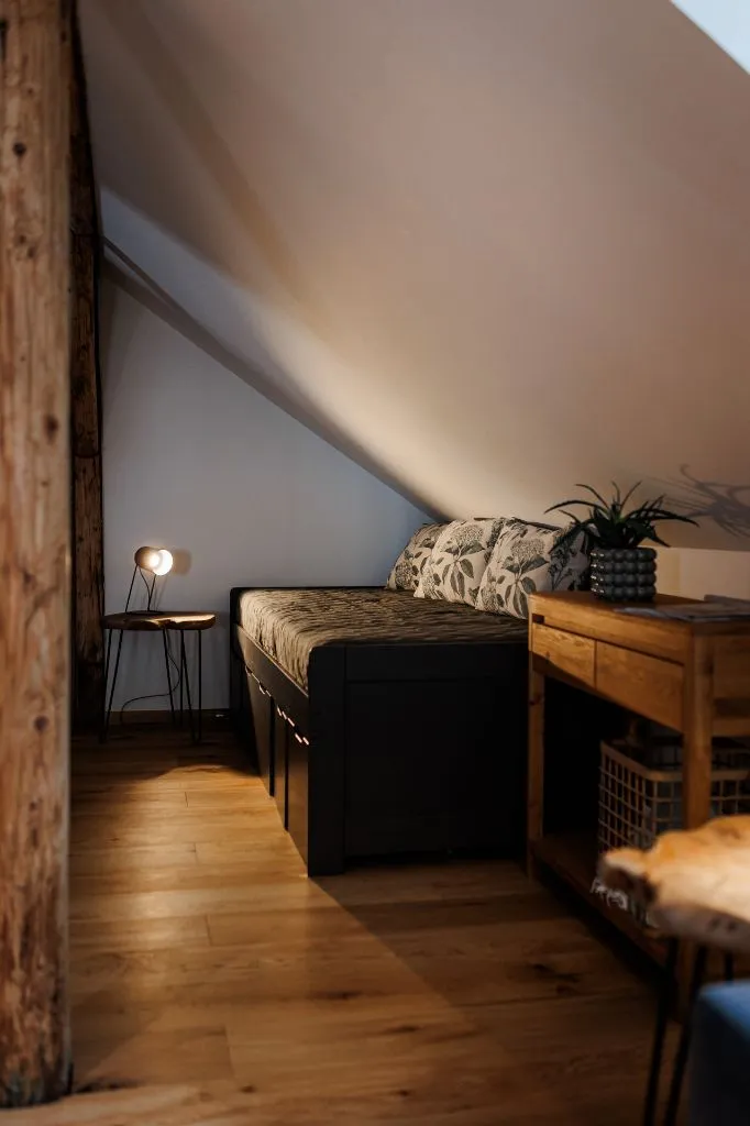 Lůžka jsou rozmístěna ve třech pokojích. V prvním pokoji se nachází manželská postel, ve druhém pokoji se nachází jednolůžko a manželská postel a ve třetím pokoji jednolůžko a pohovka pro 2 osoby pro každodenní spaní.