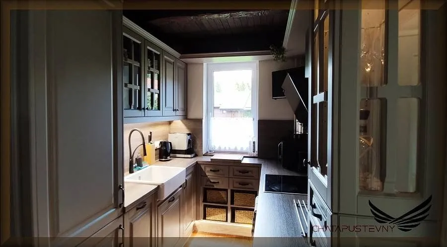 Vybavená kuchyňská linka (el. multifunkční trouba se sklokeramickou deskou, 2x lednička, mikrovlnná trouba, kávovar + presso, rychlovarná konvice) v obývacím pokoji s LCD - SAT - DVD - domácím kinem, krbem, 3 ložnice, 1x koupelna s sprchovacím koutem a WC, 1x koupelna s vanou, sprchou a WC.