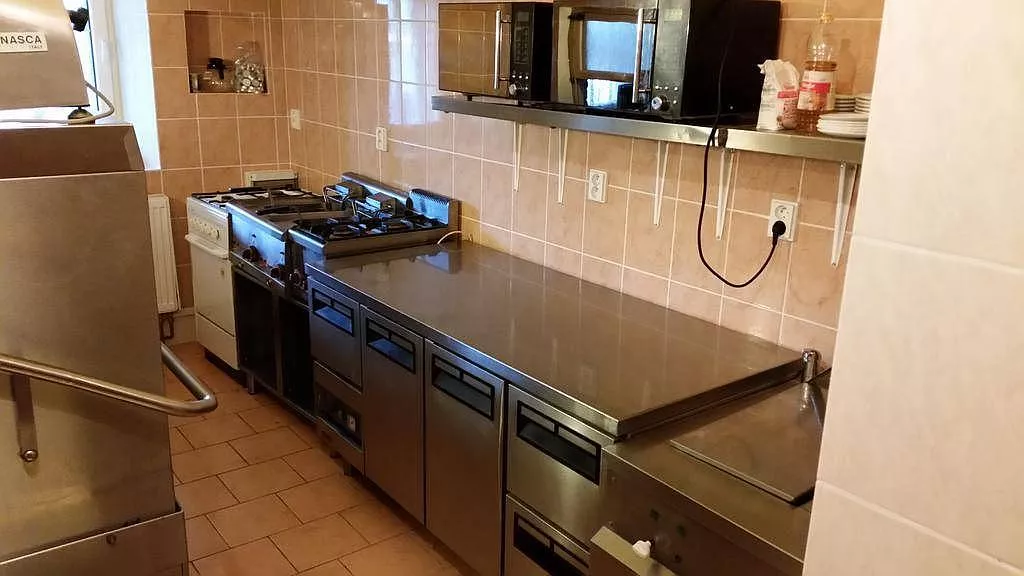 Kuchyň - plynový sporák a trouba, lednice, velký friťák, kontaktní gril, toustovač, rychlovarná konvice, kávovar, myčka, mikrovlnné trouby, hrnce, talíře, příbory, sklo.
