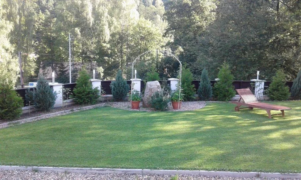 Udržovaná travnatá plocha, požární nádrž. Celý prostor oplocen. Hřiště se nachází pět minut chůze od chalupy.