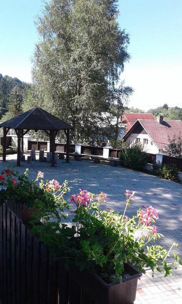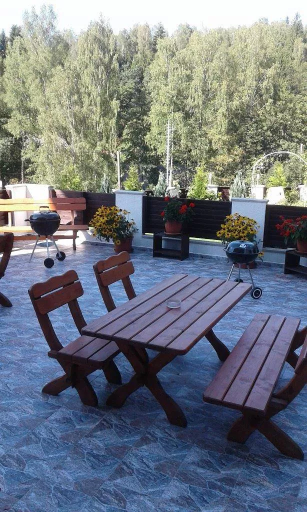 Objekt je oplocen, před objektem je větší plocha, kde jsou lavice se stoly, gril. Dětské houpačky a trampolína.