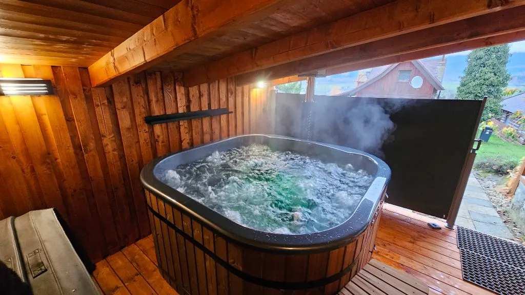 Celoročně obyvatelná chata s velkou zastřešenou terasou, s posezením a s grilem u vstupu menší pergola s koupacím sudem s viřivkou a bazénem v poklidné častí Hutisko - Dvořiska